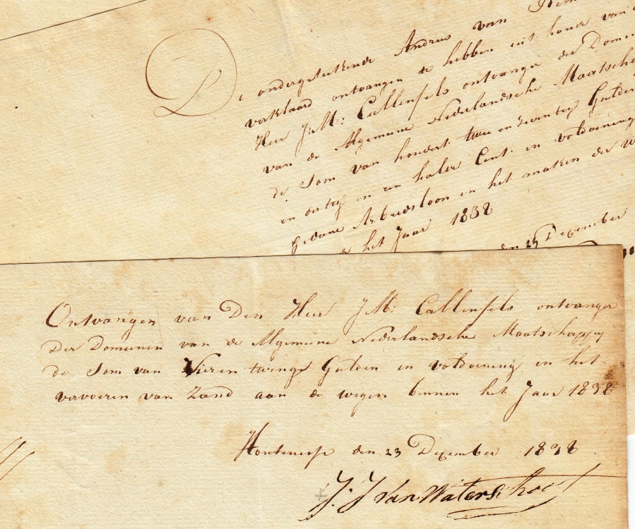 3. Enveloppe met een zegel van 20 cent (cat. 24), afgestempeld in Deventer, 22 februari 1892. Met roze ‘aangetekend’-plakker en opschrift ‘Met ingesloten waarde honderd tien gulden’. Lakzegels op achterkant.