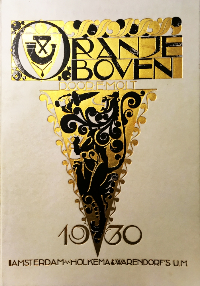25. (HOEF, Chris van der / Jac. J. van GOOR). MOLT, E. Oranje Boven. Een boek voor jong en oud, uitgegeven ter gelegenheid van den 50sten verjaardag van H.M. Koningin Wilhelmina. Geïllustreerd met 24 portretten [van leden van het Oranjehuis]. Amsterdam, Van Holkema & Warendorf, 1930. Versierd perkament. 248 p. Met 24 fotografische afbeeldingen van penningen, ontworpen door Jac. J. van Goor, in sierkader op kunstdrukpapier. 1e druk. Boekband iets geschaafd.