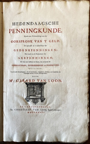 28. LOON, Gerard van Hedendaagsche Penningkunde, zynde eene verhandeling van den Oorspronk van’t geld, de opkomst en’t onderscheyd der Gedenkpenningen; den Aardt en de Rekenwyze der Legpenningen; de wyze van’t syfferen der ouden, den oorspronk der Syfferletteren, Toverpenningen en Noodmunten. Midsgaders van de vaste Grondregelen, die in ’t ontwerpen, vergaderen, schikken en behandelen der Penningen moeten worden inachtgenomen. Den Haag, Christiaan van Lom, 1732. 49 x 31 cm. Karige 18e-eeuwse interimband van zacht karton, op de rug met touwen genaaid. Groot papier, niet afgesneden, met zeer brede marges. (12), 390, (26) p. Met vele kleine gravuurtjes van munten en penningen. 1e druk. Enigzins los.