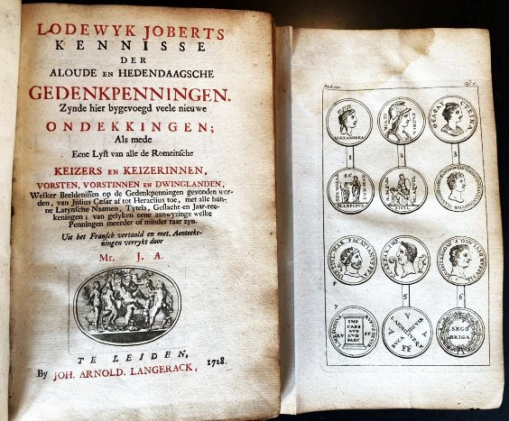 26. JOBERT, Louis Lodewyk Joberts Kennisse der aloude en hedendaagsche gedenkpenningen. Zynde hier bygevoegd veele nieuwe ondekkingen; Als mede eene Lyst van alle de Romeinsche Keizers en Keizerinnen, vorsten, vorstinnen en dwinglanden, welker beeldenissen op de gedenkpenningen gevonden worden, van Julius Caesar af tot Heraclius toe (…). Uit het Fransch vertaald en met Aanteekeningen verrykt door Mr. J.A. Leiden, J.A. Langerack, 1728. Herbonden in stevig, modern kunstleer. 462, (50) p. 11 uitslaande bladen met afbeeldingen + kleine gravure op de titelpagina. 1e druk. Papier wat verbruind, enkele watervlekken, maar compleet.