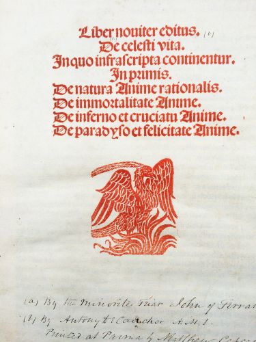 2. FERRARIENSIS, Johannes De Coelesti vita. Venice, Matteo Capcasa (di Codeca), per Hieronymus Blondus, 19 December, 1494. 30,6 x 22,1 cm. Bound in morocco-backed boards around 1800-1850, with title label, a bit worn at the sides. Bookplate of Thomas South and of the BPhH. 72 leaves. Title printed in RED, with printer’s mark and decorated woodcut initials. Handwritten notes on title page and flyleaves.