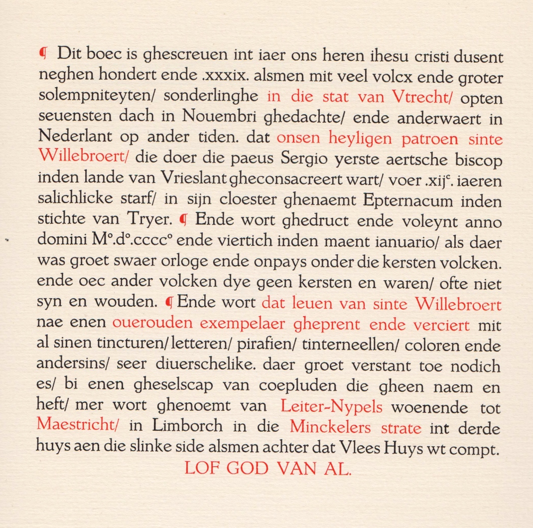 8. LEGENDE VAN SINTE WILLEBROERT Die legende van Sinte Willebroert. Gereproduceerd uit het passionael winterstuc gedrukt door Gheraert Leeu ter Goude 31 juli 1478. Verklarende tekst van kanunnik E. Lagerwey. Aanhangsel (…) door pater dr. B. Kruitwagen, o.f.m. Maastricht, Leiter-Nypels, 1940. Folio (32 x 26 cm). Vellum paper covered boards. (2), 62 p. Printed in red, blue and black in 500 numbered copies. Upper cover a bit stained, with inscriptions previous owners on flyleaf.