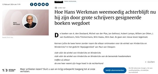 Hans Werkman in het Nederlands Dagblad van 12 februari 2024, over de verkoop van zijn boeken aan ons antiquariaat.