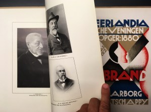 122. (TROELSTRA, Pieter Jelles) Gedenkboek der Onderlinge Brandwaarborgmaatschappij “Neerlandia”. Opgericht 25 Mei 1880 te Leeuwarden. In Mei 1906 gevestigd te Scheveningen. 1880 – 25 Mei – 1930. (Den Haag, Neerlandia, 1930). 33 x 25 cm. Halflinnen met gedecoreerd voorplat. 48 p. Met foto’s en fraai getekende grafieken, en met een reproductie van een affiche in kleuren, gesigneerd ”29 JHA ‘. 1e druk. Mooi en in uitstekende staat.