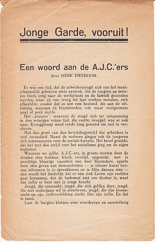 132. VORRINK, Koos De A.J.C. als deel der moderne arbeidersbeweging. Amsterdam, Centrale van Arbeiders-Jeugdverenigingen, (1923). 27 x 19 cm. Geniet. 16 p. 1e druk. Aan de randen verkleurd, maar zeer gaaf.