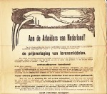 * Groot aanplakbiljet met uitleg over het standpunt van de regering tegenover de werkstaking, die op maandag 6 april 1903 werd uitgeroepen en de elfde werd beëindigd. Oproep aan de arbeiders om zich af te keren van de socialistische stakers. Dit affiche dateert van begin april 1903.