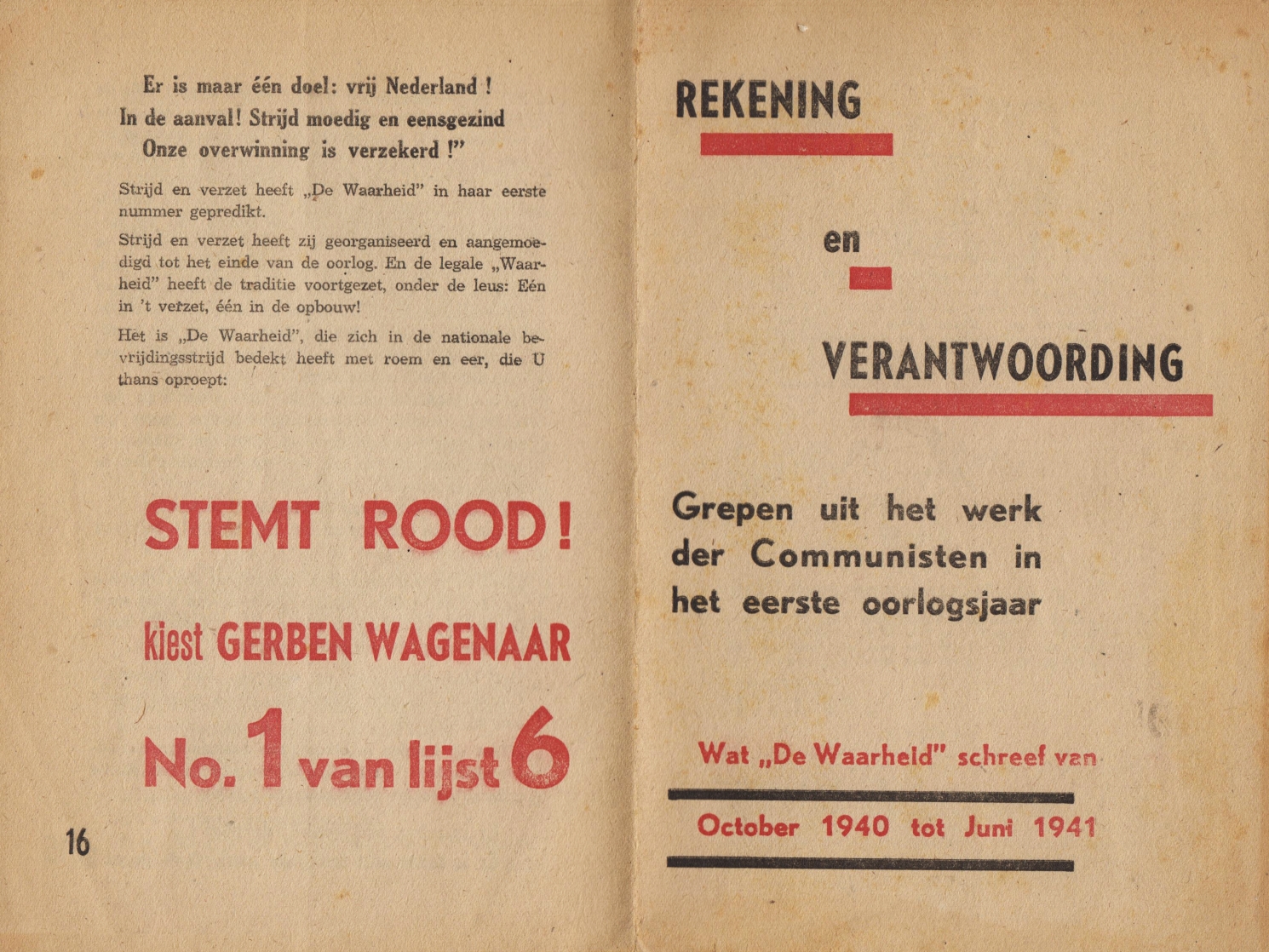 * Voor de Tweede-Kamerverkiezingen van 1946, maar ook 1948 en 1952, tenslotte 1959 (o.a. Nieuw-Guinea) en 1962, de Provinciale Statenverkiezing Zeeland. Ook met een vroeg, gestencild (moeilijk leesbaar, met potloodaantekeningen) discussiestuk ‘Eenige richtlijnen’ en een mooi versierd krantje voor de Provinciale Statenverkiezingen van 1950. Veel aandacht voor partijleider Jan Schouten (1883-1963), zelfs, heel frivool, een bierviltje met zijn portret.
