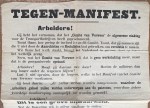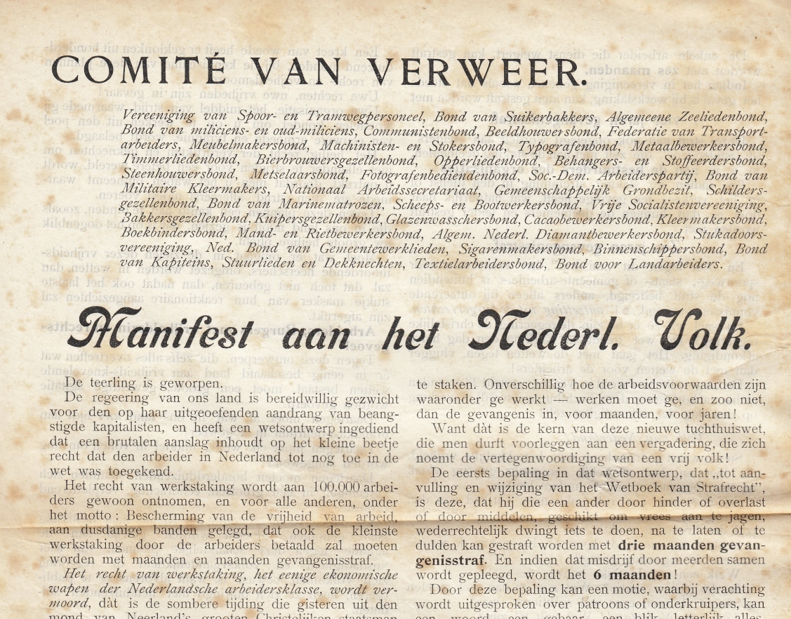 * Strooibiljet dat dateert van tussen de eerste spoorwegstaking van 29 januari 1903 en de tweede van begin april 1903. Het is uitgegeven door het één week eerder, op 20 februari opgerichte Comité van Verweer dat zich inzette voor betere arbeidsomstandigheden en hogere lonen, onder meer door stakingen te organiseren. Dit manifest roept in ‘sombere bitterheid’ op tot verzet tegen de draconische anti-stakingsmaatregelen van de Nederlandse regering onder Abraham Kuyper, die werkweigering met jarenlange gevangenisstraf bedreigde. Uniek document uit de tijd van Gansch het raderwerk staat stil, als uw machtige arm het wil.