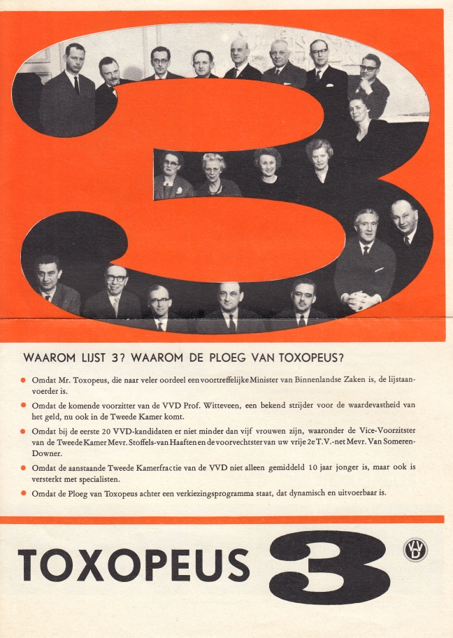 130. VOLKSPARTIJ VOOR VRIJHEID EN DEMOCRATIE Waarom lijst 3? Waarom de ploeg van Toxopeus? Zonder plaats, Hoofdbestuur van de Volkspartij voor Vrijheid en Democratie, [1963]. 27 x 19 cm. Gevouwen blad, gedrukt in oranje en zwart. Met portretten van Toxopeus en 19 andere kandidaat-Kamerleden. Netjes.