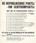 90. REPUBLIKEINSE PARTIJ De Republikeinse Partij – Uw Centrumpartij. Wat wil de Republikeinse Partij? Rotterdam, Republikeinse Partij, [1966]. 25 x 22 cm. Eenzijdig bedrukt strooiblaadje. Alleen tekst. Horizontale vouw.