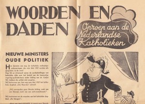 29. (ROMME, Carl) Woorden en daden. Oproep aan de Nederlandse Katholieken. (&) De knuppel in het hoenderhok! 1. SDAP, [1938]. 41 x 30 cm. Pamflet in krantvorm. 4 p. Geïllustreerd. In rood en zwart. 1e druk. Tweemaal gevouwen, zoals uitgegeven. In prima conditie.