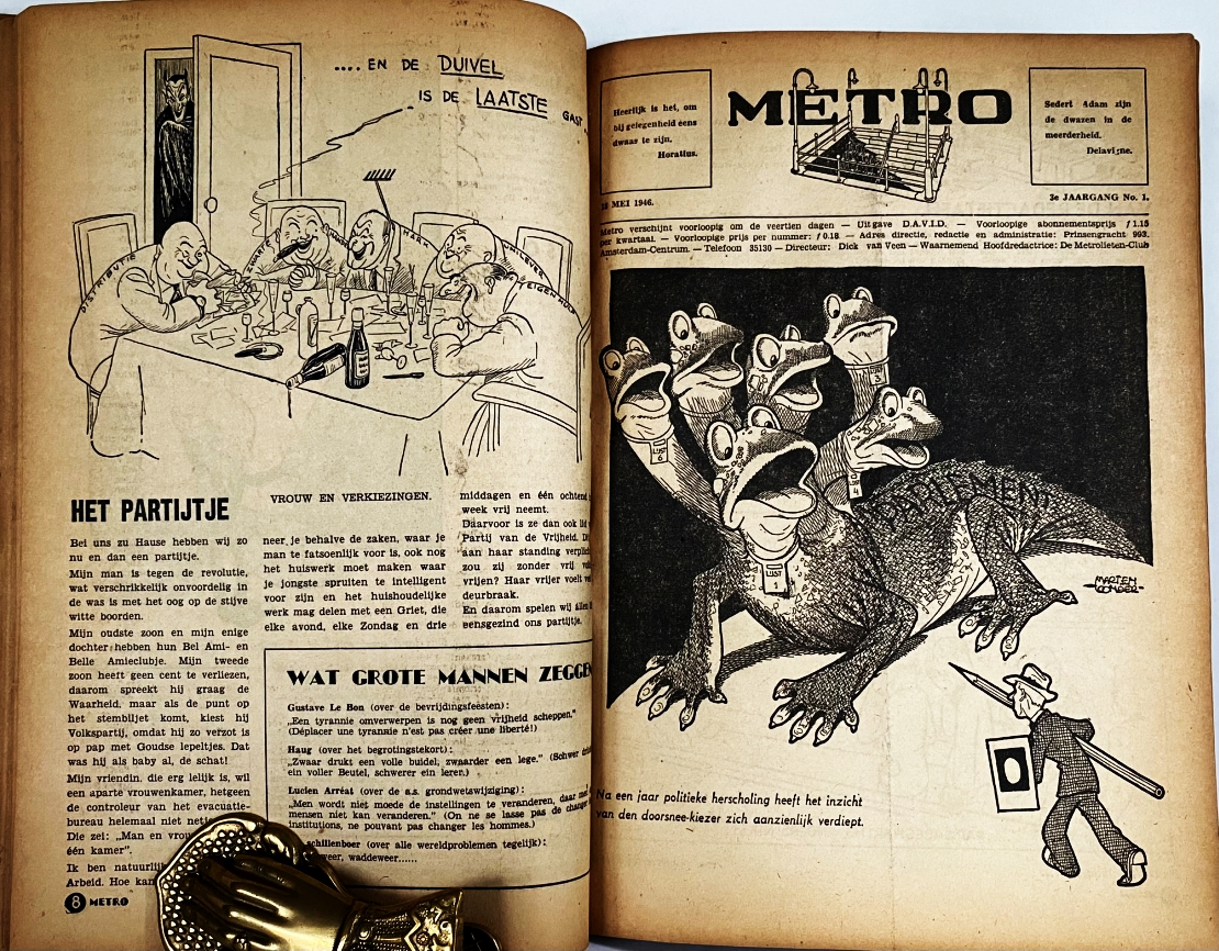 * Briljant satirisch tijdschrift, dat voortkomt uit het gelijknamige illegale blad, vol scherpe humor waarin de Nederlandse en buitenlandse politiek op de korrel wordt genomen door kunstenaars die vergeefs vlasten op vernieuwing na de oorlog. Rake cartoons en vignetten van onder anderen Marten Toonder, Hans Kresse, Wim Bijmoer (?), Kees Kelfkens en Henk Kabos, naast vele pseudoniemen. Ook de geschreven teksten zijn vrijwel allemaal pseudo- of anoniem. Het tijdschrift Metro is in zijn geheel herdrukt in 1994, maar wij houden meer van het ruig en tastbaar origineel.