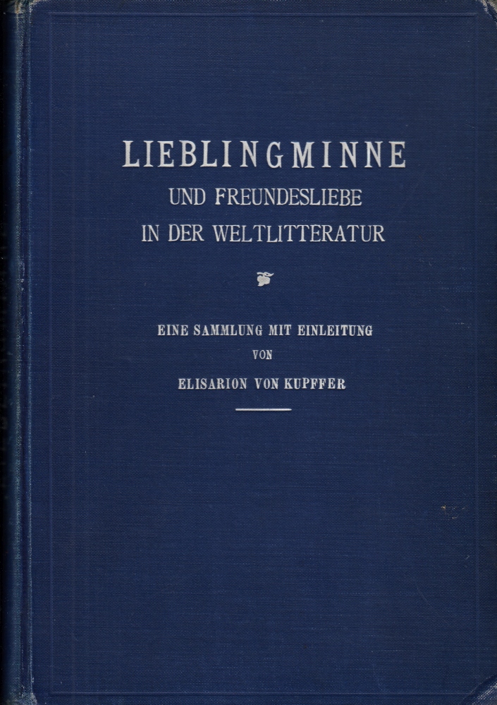 30. KUPFFER, Elisarion von Lieblingminne und Freundschaftsliebe in der Weltliteratur. Eine Sammlung imit einer ethisch-politischen Einleitung von Elisarion von Kupffer. Leipzig, Max Spohr, [1903]. Original blue cloth. (4), 226 p. 1st edition. Small strip of first flyleaf cut out. A little wear.