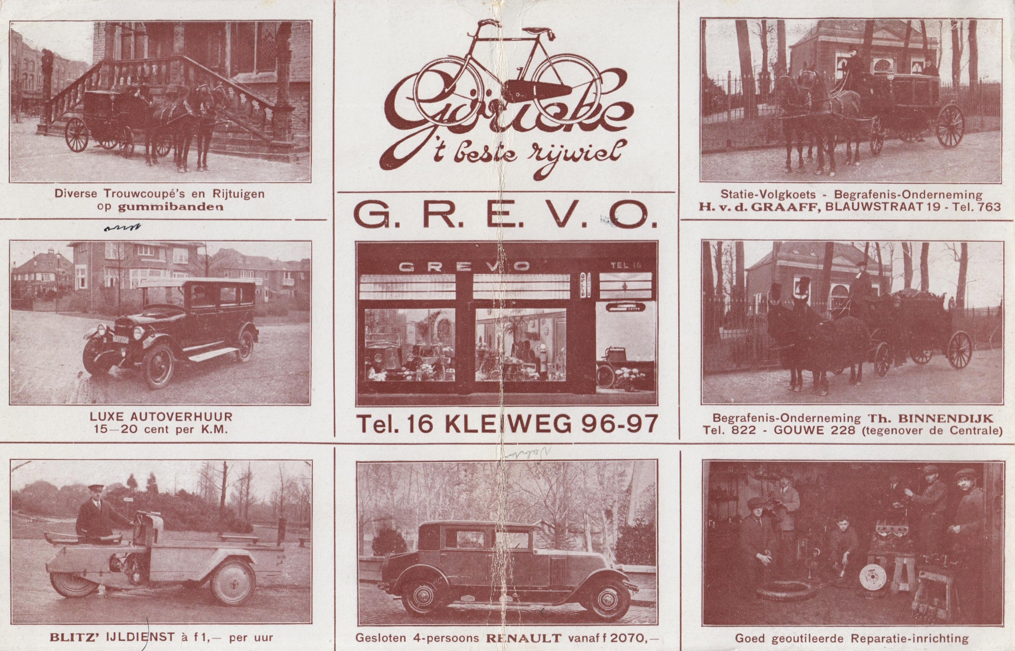 * Trouwcoupé’s en rijtuigen op gummibanden, autoverhuur, Blitz’ IJldienst met gemotoriseerde bakfiets, G.R.E.V.O. rijwielen, gesloten 4-persoons Renault te koop v.a. f. 2070, twee begrafeniskoetsbedrijven en een reparatie-inrichting, allemaal samen op één blad.