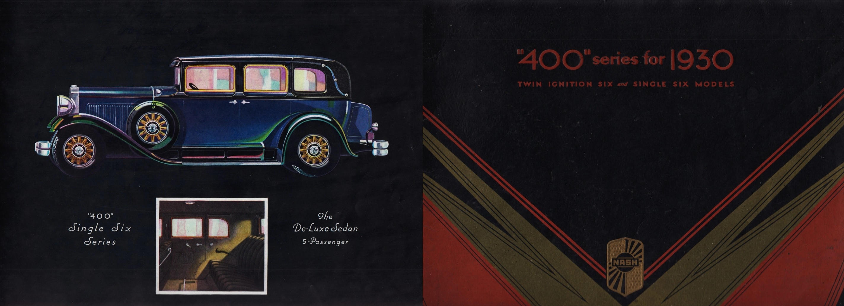 7. NASH “400” series voor 1930. Den Haag, N.V. H. Englebert’s Automobielhandel, 1930. Oblong. Origineel omslag in rood, goud en zwart. 24 p. Met illustraties in kleuren. Nietjes ontbreken. Enkele kreukjes.