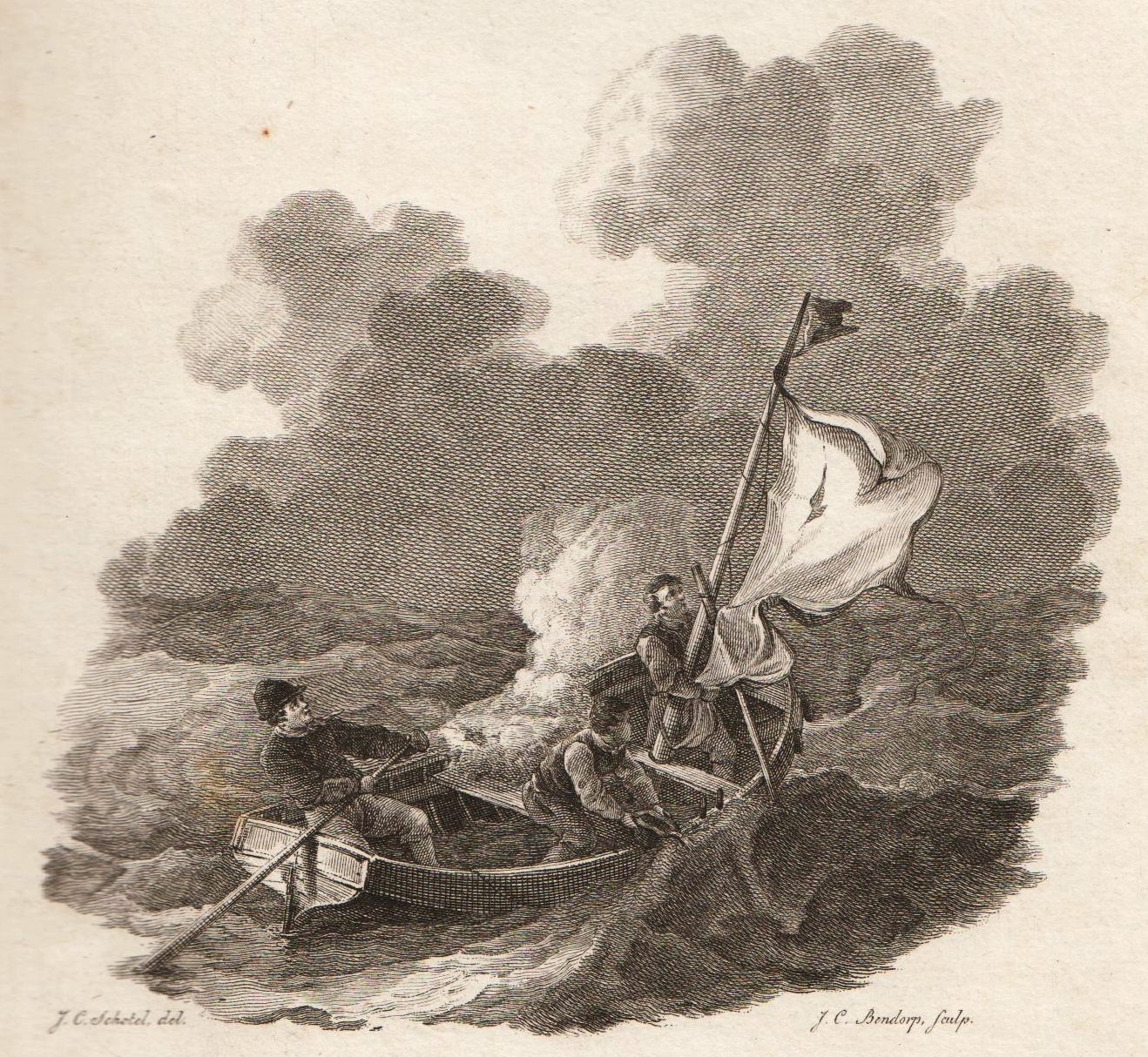 * Dichtwerk over de barre tocht van drie Scheveningers die Engelse gevangenschap ontvluchtten. Met dramatische titelprent van de beroemde zeeschilder Schotel.