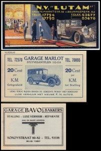 1. 143 x 252 mm. NV. “Lutam” (‘Luxe Taxi Maatschappij’). Den Haag. In kleur. Signatuur Mathieu van der Werff. Op de afbeelding zie je een welgesteld echtpaar dat in een luxe auto stapt. Ongebruikt.