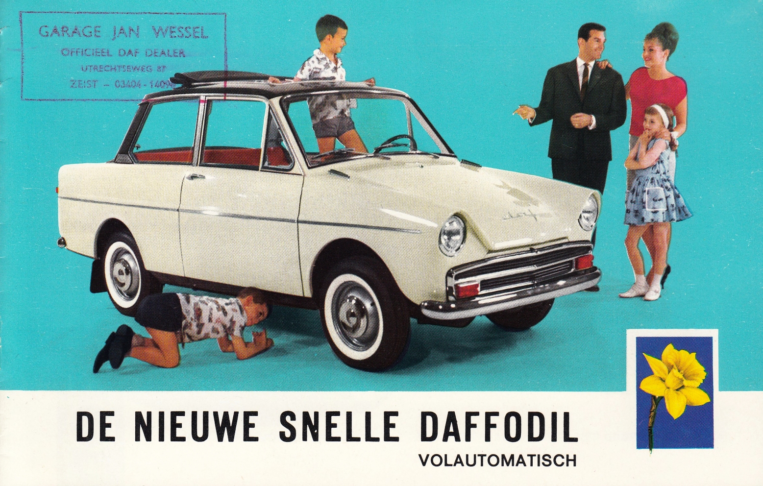 2. DAFFODIL De nieuwe snelle Daffodil. Volautomatisch. Eindhoven, Van Doorne’s Automobielfabriek N.V., [1964]. Oblong 20 x 13 cm. Geniet. 8 p. Illustraties in kleuren. Stempel van Garage Jan Wessel in Zeist voorop. Als nieuw.