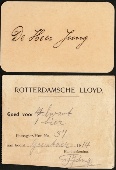 7. ROTTERDAMSCHE LLOYD Twee waardebonnen uit 1914 van het SS Goentoer (1914). Eenvoudige bonnetjes (8 x 10 cm) met opdruk ‘Rotterdamsche Lloyd’, ‘Goed voor’, ‘Passagier-Hut No.’ e.d. Met potlood ingevuld: ‘4 kwast/ 1 bier’ en ‘1 limonade/ 1 port’, Passagier-Hut 37, P. Jung. Bijgevoegd een handgeschreven kaartje met de naam van de gelukkige: ‘De Heer Jung’. Een aardig ensemble.