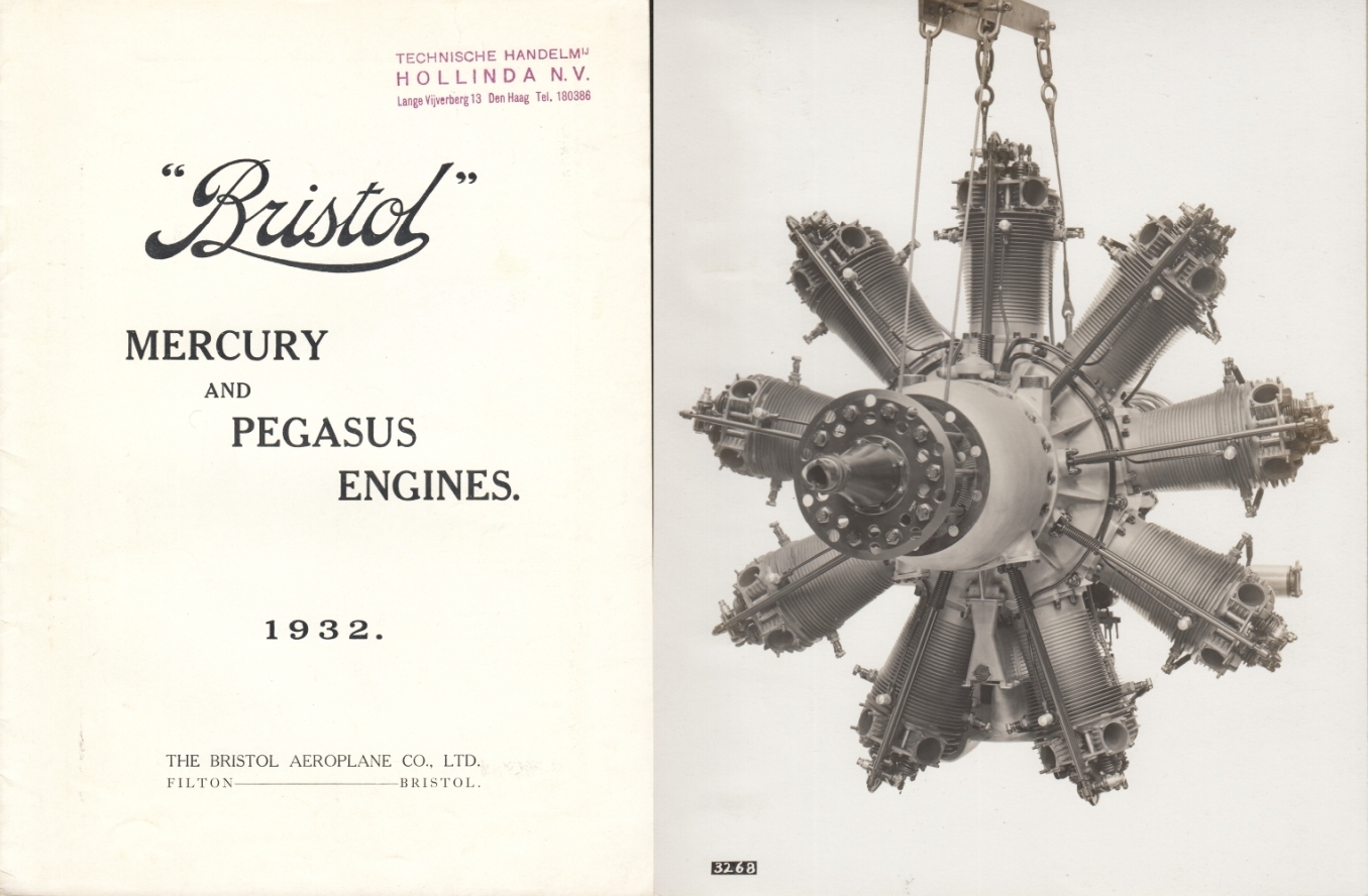 2. AIRCRAFT ENGINES Collection of original photos and publications of the Bristol Aeroplane Company, 1932 and 1933. 1. “Bristol” Mercury and Pegasus Engines 1932. 28 x 20 cm. Stapled. 12 p. without wrappers, as issued. Illustrated with engine pictures and graphs. With a Dutch reseller’s stamp. Fine condition.