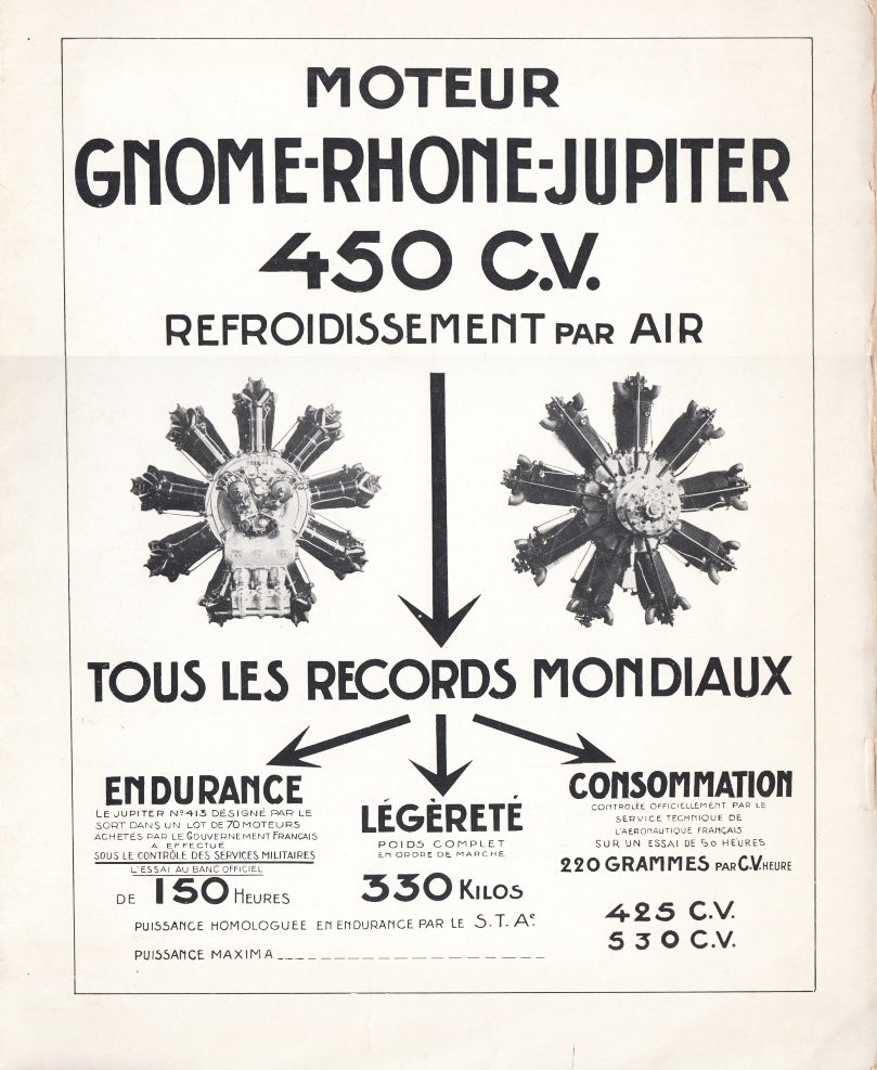 * Large trade publication emphasizing the records and other achievements of airplanes with Gnome-Rhône engines, a.o. Blériot, Bréguet, Bristol, Caproni, Dewoitine, Dornier, Fokker, Gamecock, Goliath, Gourdou, Hawker, Jabiru, Latham, Parnal, Potez, Sopwith, Spad and Wibault.