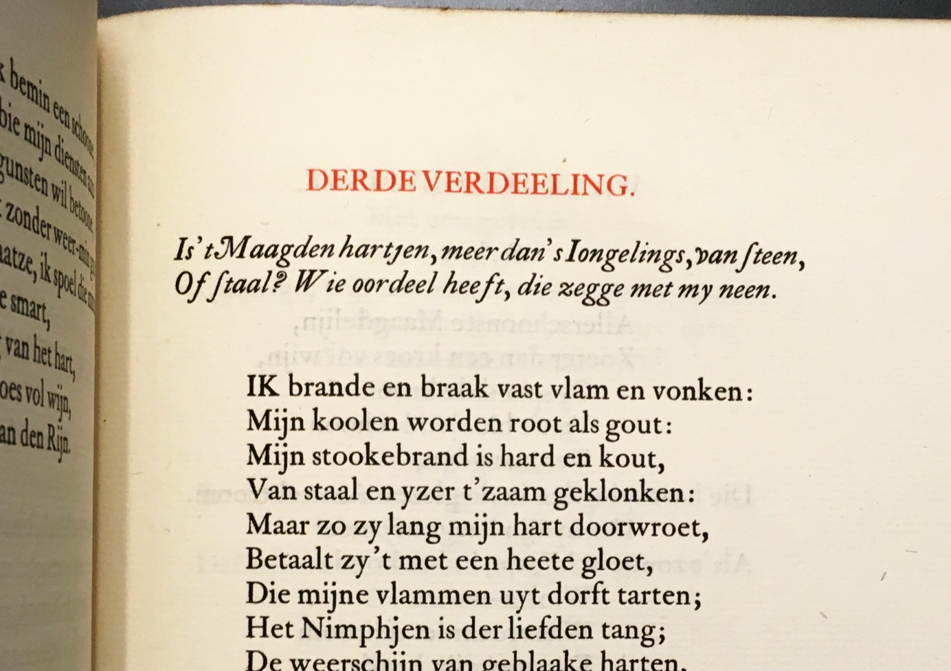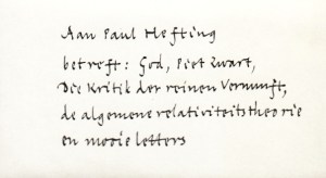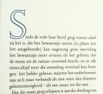 * ‘Zij zal in staat zijn poëzie te tonen zonder de noodzaak van een tekst’. Betoogje over typografie met intrigerende illustratie. In een omslag van wit, zachtglanzend Japans papier dat dankzij de envelop gaaf en fris is gebleven. Dit exemplaar was blijkens het colofon bestemd voor Dick Dooijes zelf. Een tweede exemplaar zonder envelop is te koop voor 35 euro.