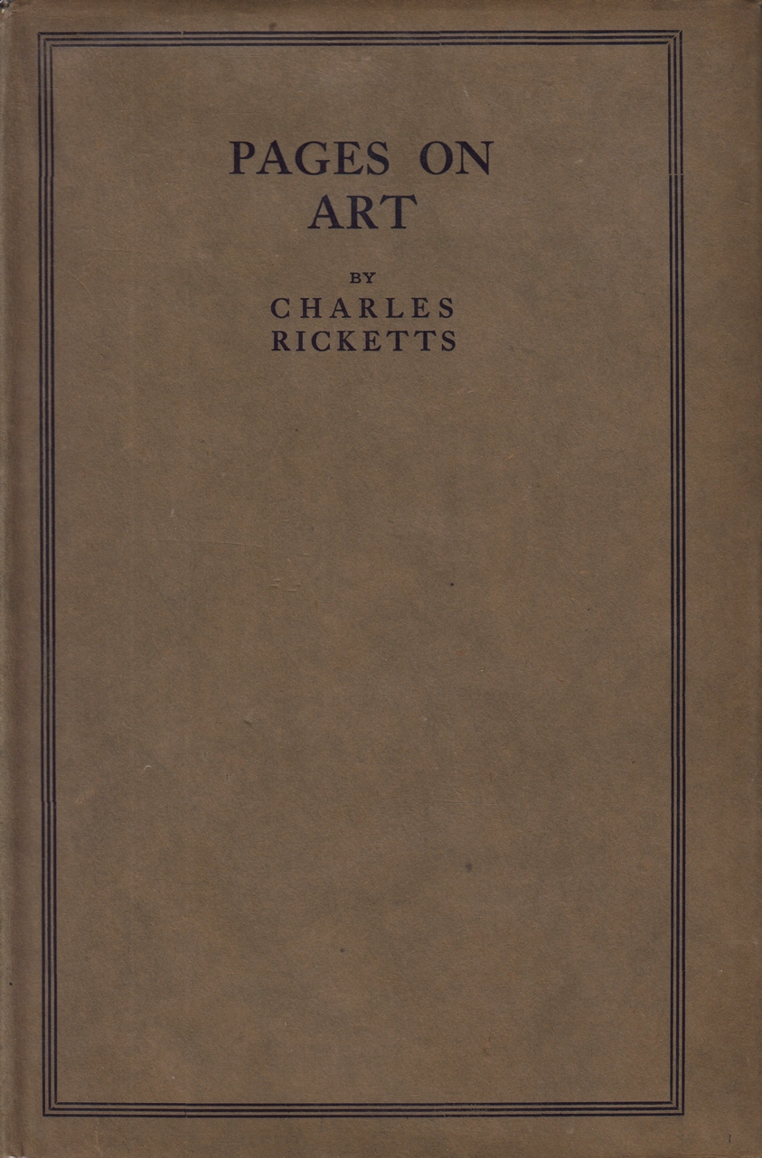 29. RICKETTS, Charles Pages on Art. (With DJ). London, Constable & Company, 1913. 23 x 15 cm. Original cloth with dust jacket. (8), 268 p. Uncut. Frontispice portrait of the author (photogravure after a photograph by Malcolm Arbuthnot) with tissue guard. 1st edition. Fine jacket, spine lettering a bit dulled, otherwise fine.