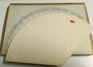 * Frederic W. Goudy (pronounced ‘Gaudi’, 1865-1947) was a very productive type designer (133 self-designed types!), who worked mainly intuitively. Some of the typefaces still in use are Goudy, Copperplate Gothic (for business cards), Kennerley Old Style and Deepdene. The reason he received a celebratory book on his 74th birthday is that in 1939 his workshop with margin equipment and work archive was lost to a fire for the second time – the first time was in 1908.