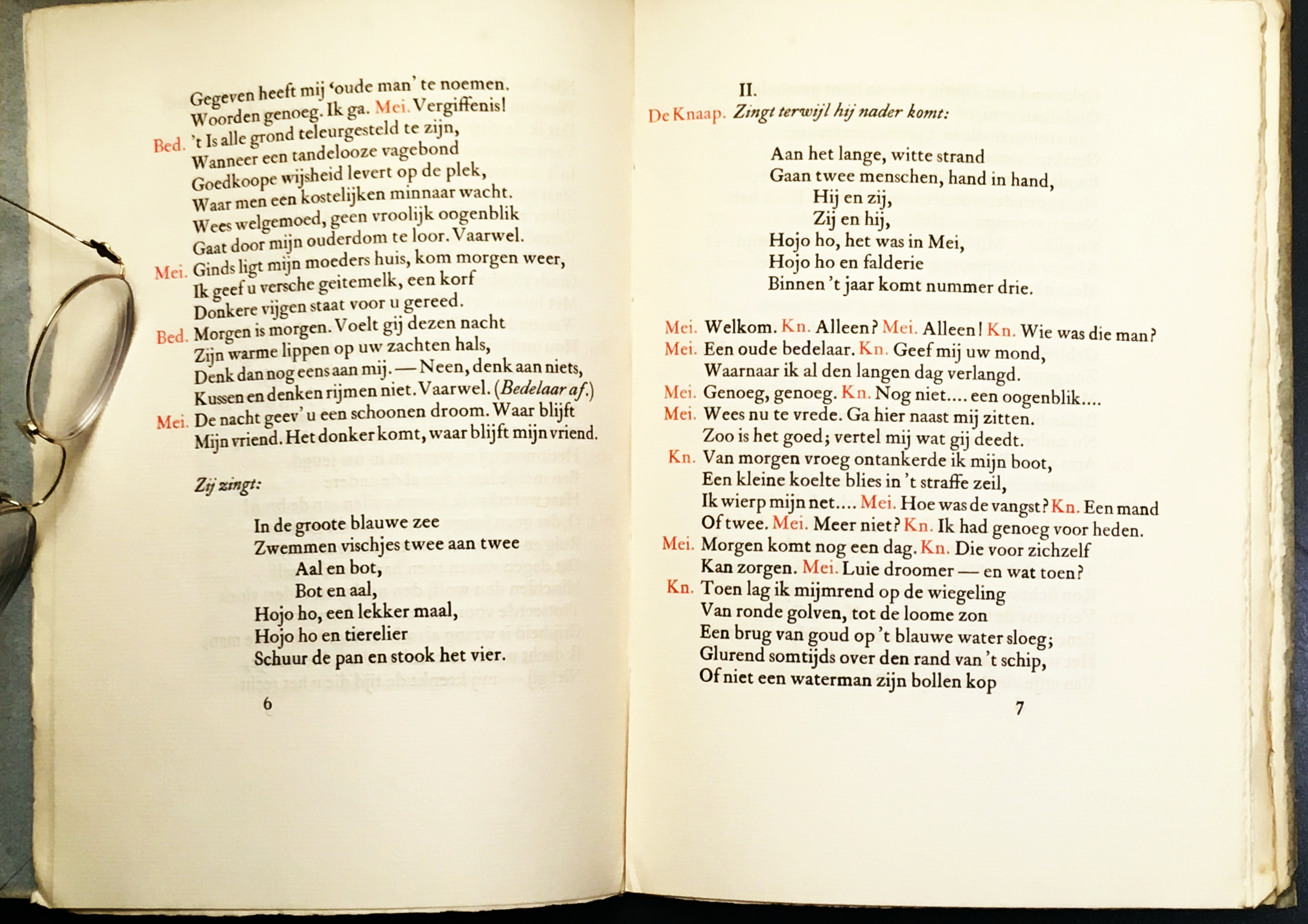 * ‘Bewaard gebleven vellen maakten het mogelijk aan alle exemplaren van dit Agri Montis Pers-boekje een origineel specimen van elk van de vier Heuvelpers-uitgaven toe te voegen’. Dit is een extra prettig exemplaar, omdat van Fromentin en Spinoza de eerste tekstpagina is bijgevoegd (van Spinoza de titel in zwarte kapitalen en een prachtige A als beginletter) en van Rossetti de titelpagina, de pagina met de titel in rode sierkapitalen en de eerste tekstpagina met fantastische B als initiaal. Prachtige, informatieve uitgave met échte proefvellen van De Heuvelpers! (De afbeelding is een pagina uit Heine’s Nordsee).