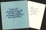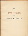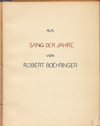 2. BOEHRINGER, Robert Aus Sang der jahre. Gekalligrafeerd door een onbekende in Stefan-George-achtig handschrift in rood en zwart op Friedenau-papier en in een zelfgemaakt halflinnen bandje genaaid. 20 p. Met handgeschreven colophon: ‘für Jannie – zum 18. Juli 1948 – von Jula’. Eerste twee bladen aan de rand beschadigd.