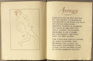 Mét de bijlage bij Stols’ artikel over de letter Lutetia van Van Krimpen, een door Enschedé in rood en zwart gedrukt vouwblad, gezet uit de Lutetia Text Romein, een tekst van Charles Maurras uit Oedipe et Cypris.