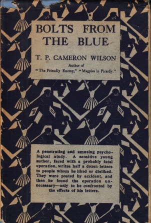 40. WILSON, T.P. Cameron Bolts from the Blue. London, Wells Gardner, Darton & Co., [1929]. Cloth with dust jacket. viii, 172 p. 1st edition. DJ spine area browned, edges a bit worn, but a very good copy with nice jacket. Flyleaves foxed.