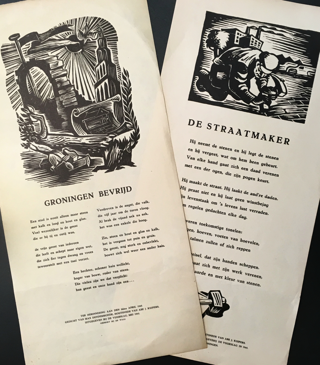 * Dit is een van 150 genummerde exemplaren op Simili Japon, en daarvan een van 25 Romeins genummerde. Felle tegen de nazi’s gerichte gedichten, o.a. ‘In Memoriam Jan R. Th. Campert’, ‘De gevangenen van Vleugel D’ en ‘Aan de gevallen drukkers’. Misleidend colofon: het boekje is niet te Amsterdam gedrukt door Dirk Voskens (trouwens een 17e-eeuwse lettersnijder), maar door Tamminga in Den Haag. De Jong 528.
