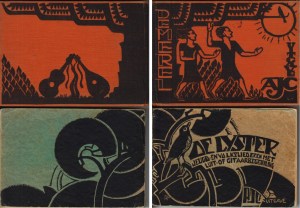 * “The Thrush – The Blackbird. Youth and Folk Songs with Notes for Lute or Guitar Accompaniment, Collected by Piet Tiggers”. Two beautiful art deco song books for use in trekking, therefore in used condition. A later AJC pocket songbook was designed by Johan van Hell (1932).